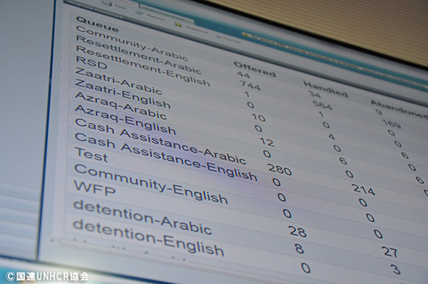 3月某日に私たちが訪れたUNHCRのヨルダン事務所に併設されている難民の抱える問題に対処するコールセンターでも、ヨルダンに住む難民の第三国定住プログラムへの関心の高まりを垣間見ることができました。日々さまざまな質問が寄せられるなか、私たちが訪問した日は、午後の時点で「第三国定住」に関する問い合わせが700件をはるかに越え、その数は他を圧倒していました。