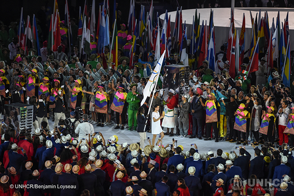 開会式に出席したフィリッポ・グランディ国連難民高等弁務官は話します。「難民選手団の入場を待ちながら、私はとても緊張していました。期待とともに、この巨大なスタジアムの大観衆が、難民の選手たちを一体どんなふうに迎えるのだろう、という思いだったのです。しかし、失望することはありませんでした。選手団の入場がアナウンスされると、皆立ち上がって拍手を送ったのです。それは単にブラジル一か国だけでなく、世界中が連帯する力強さを物語っていました」。