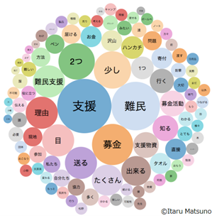 難民難民支援で「何ができるか」の生徒の話し合いを、AIによる匿名の意見集約ソフトを使って可視化したところ、「与える」ことにつながる言葉の使用が目立ちました。その方向で、わたし自身、担任として何ができるかを考え、打診しました。
